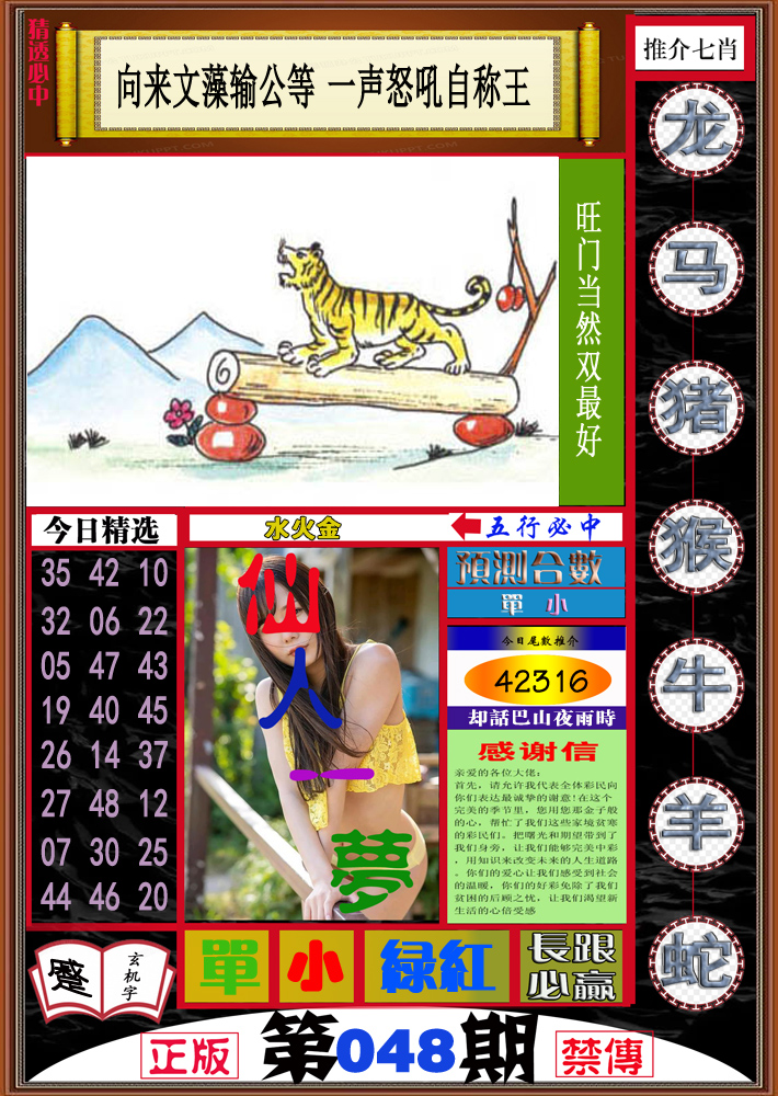 | 042期: (马12)(牛05)(虎16)(蛇13) |