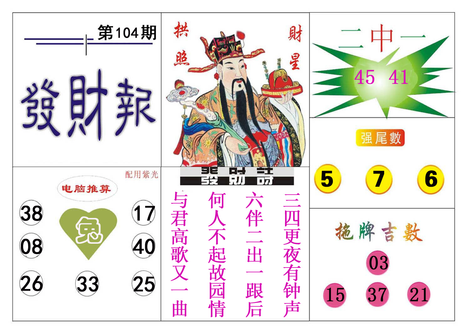 | 104期财神方位 东北-西南-正东 开 ?? |
